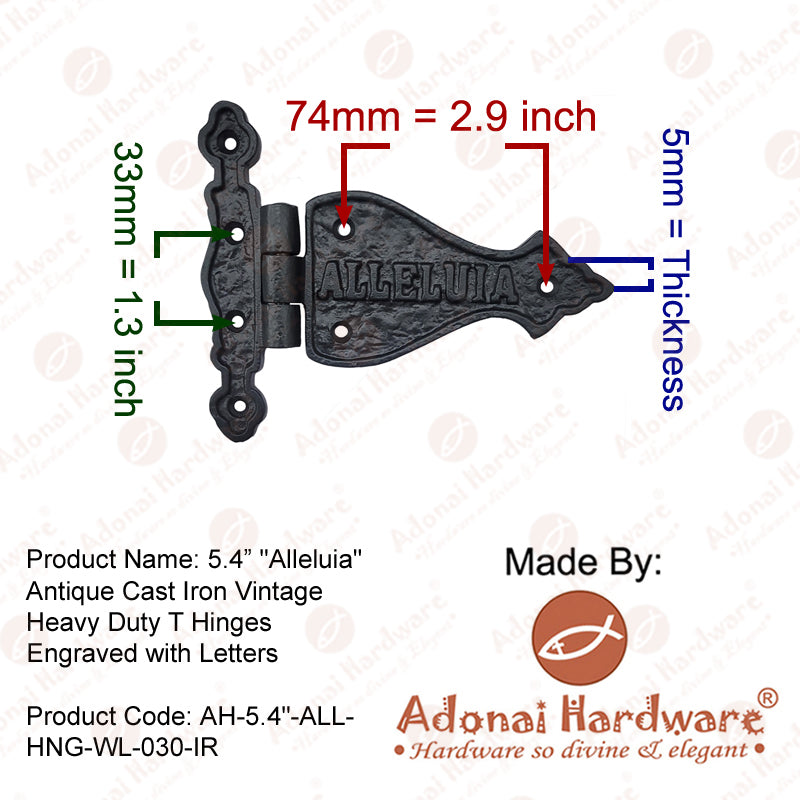 5.4 Inch Alleluia Antique Cast Iron Vintage Heavy Duty T Hinges Engraved with Letters